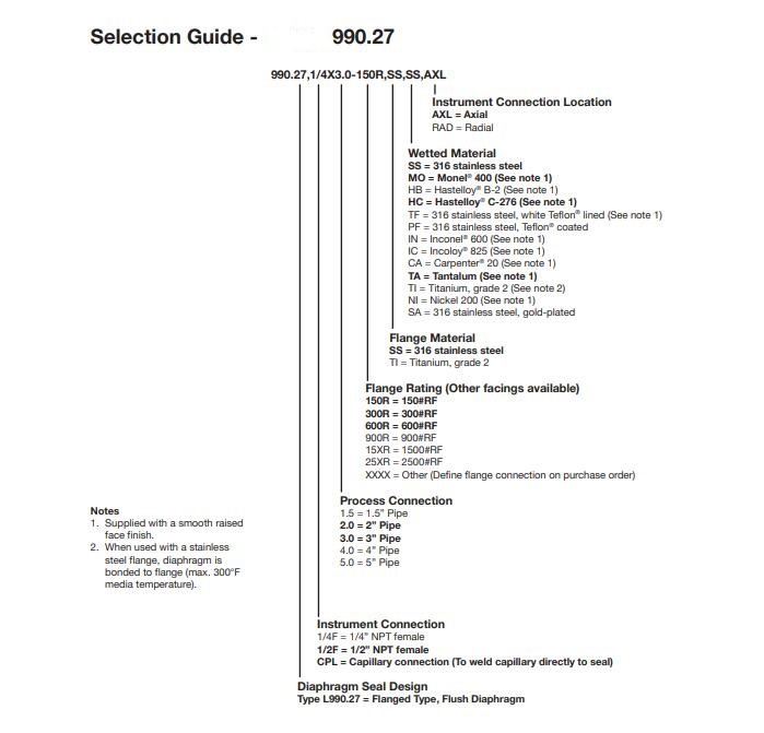| Liquides de remplissage (plage de température) | Glycérine (0/400 °F, -18/204 °C - pas pour les plages de vide ou de composés) Silicone (-40/600 °F, -40/315 °C), Halocarbure (-70/300 °F, -56/149 °C) Syltherm 800 (-40/750 °F, -40/400 °C), Huile végétale (32/248 °F, 0/120 °C), Neobee M-20 (0/320 °F, -17/160 °C), autres sur demande, également en fonction du matériau et de la configuration sélectionnés |